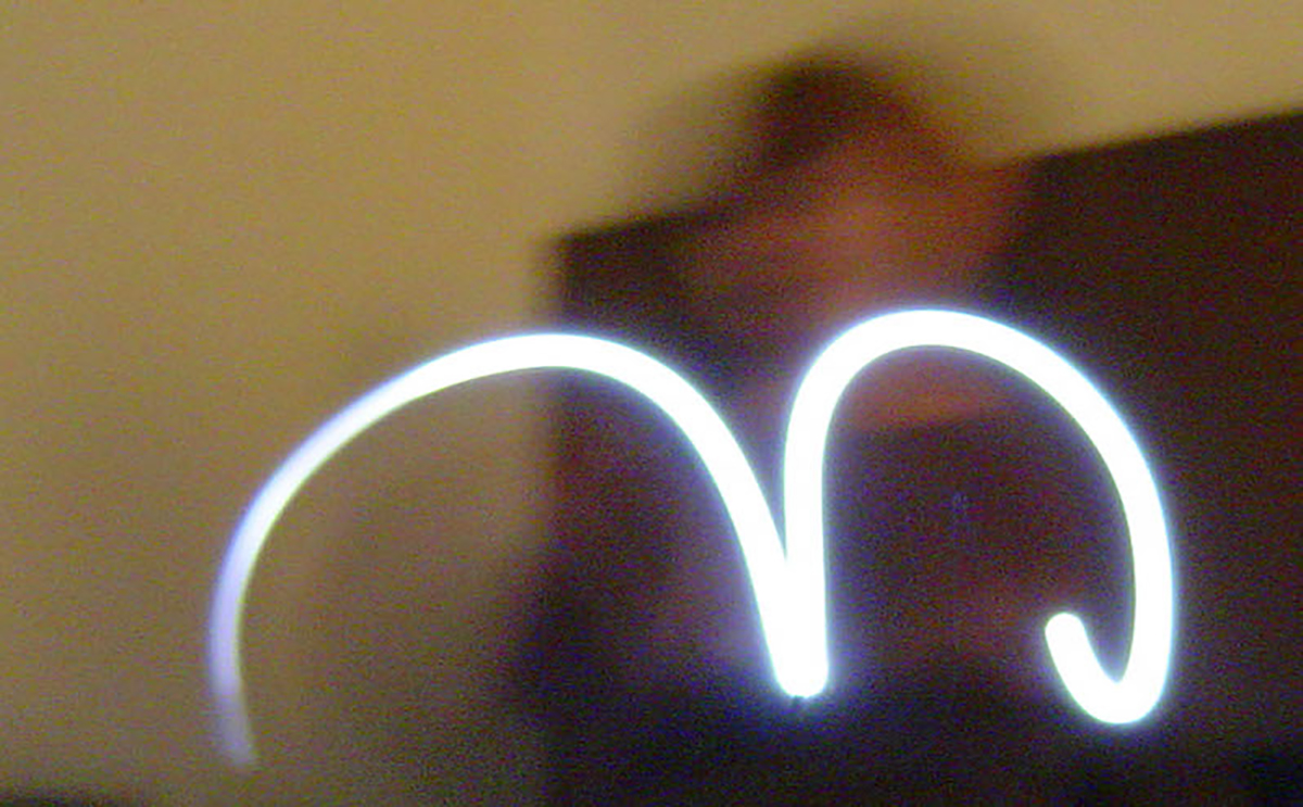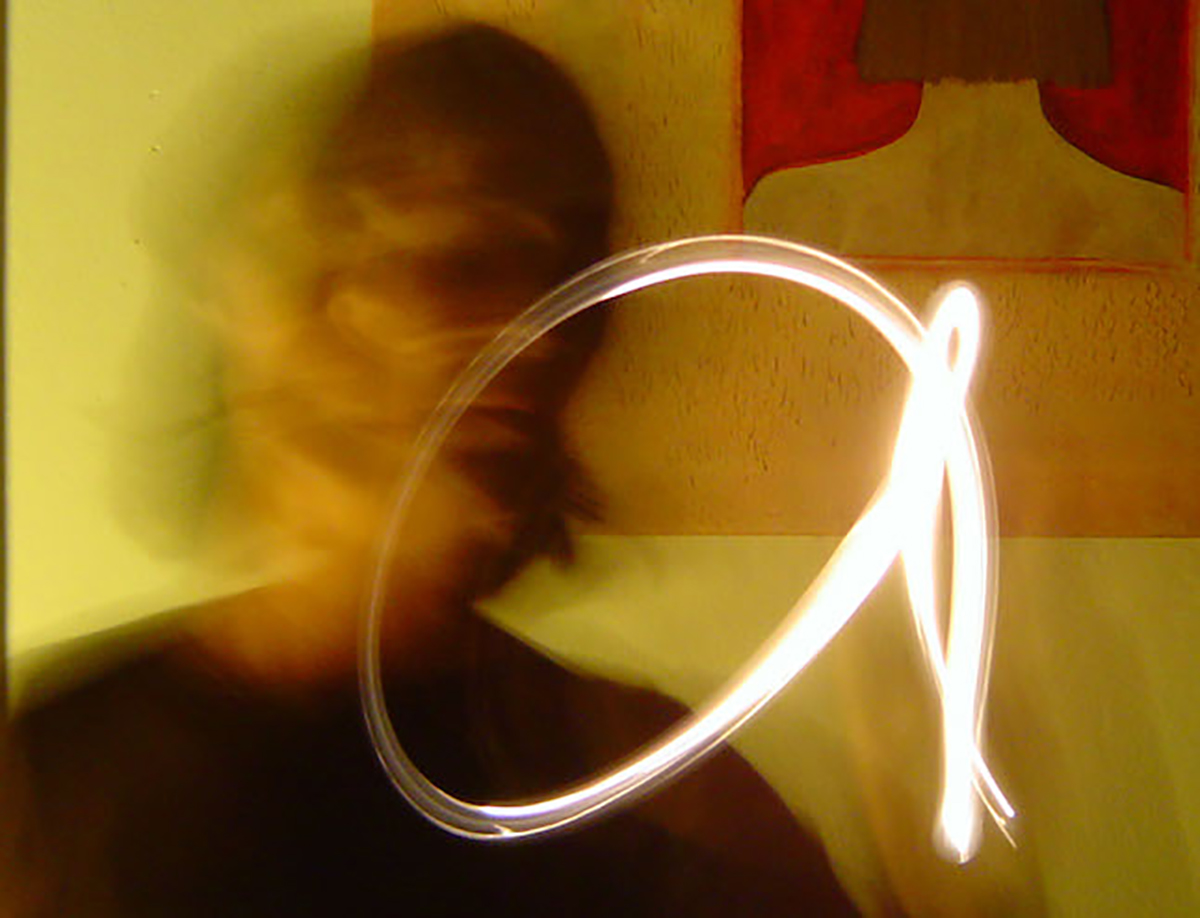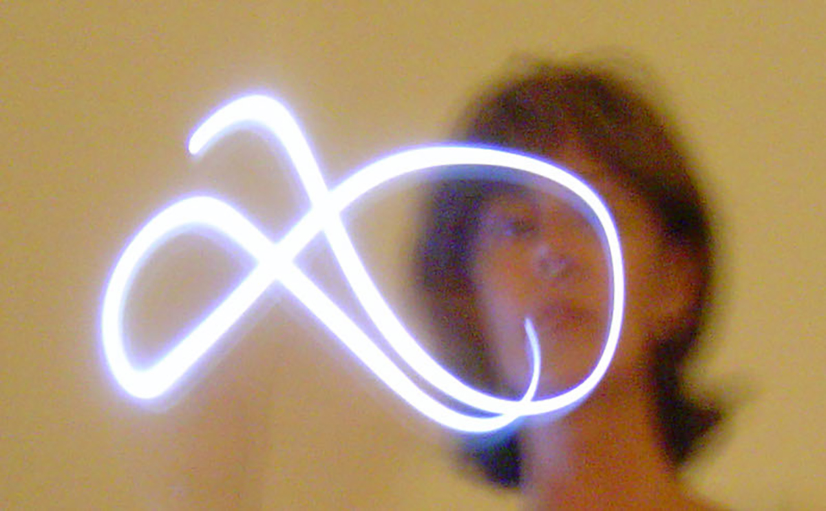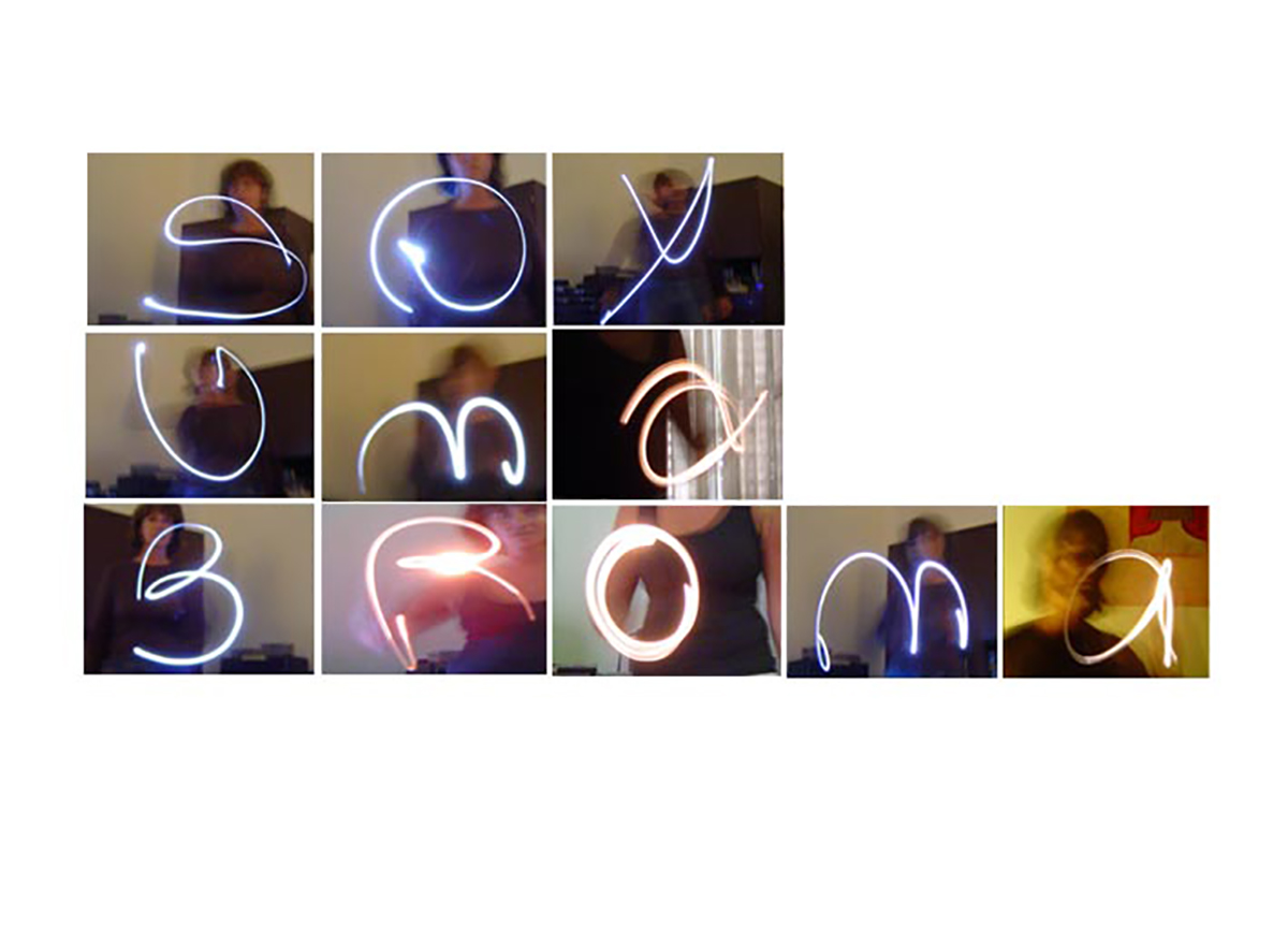 Partí de mi movimiento construyendo letras con el destello lumínico de una linterna, formando mi palabra designada “broma”. Prolongo el gesto corporal como lenguaje, escribo con el cuerpo.