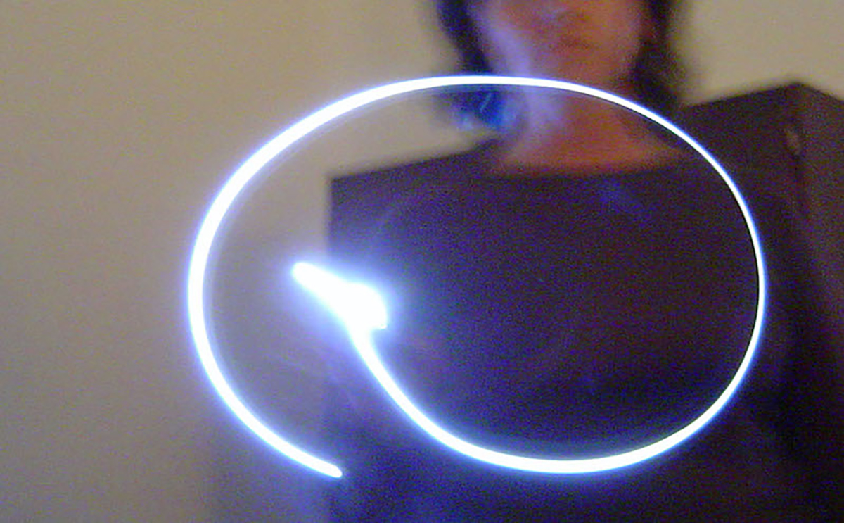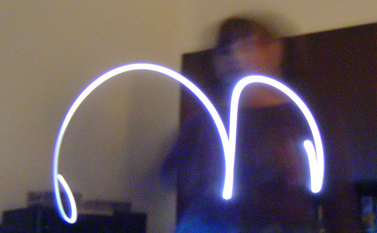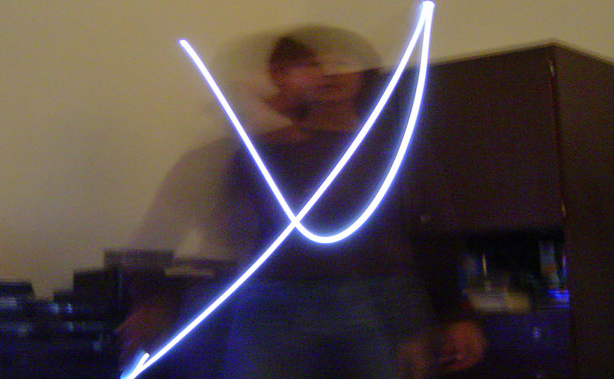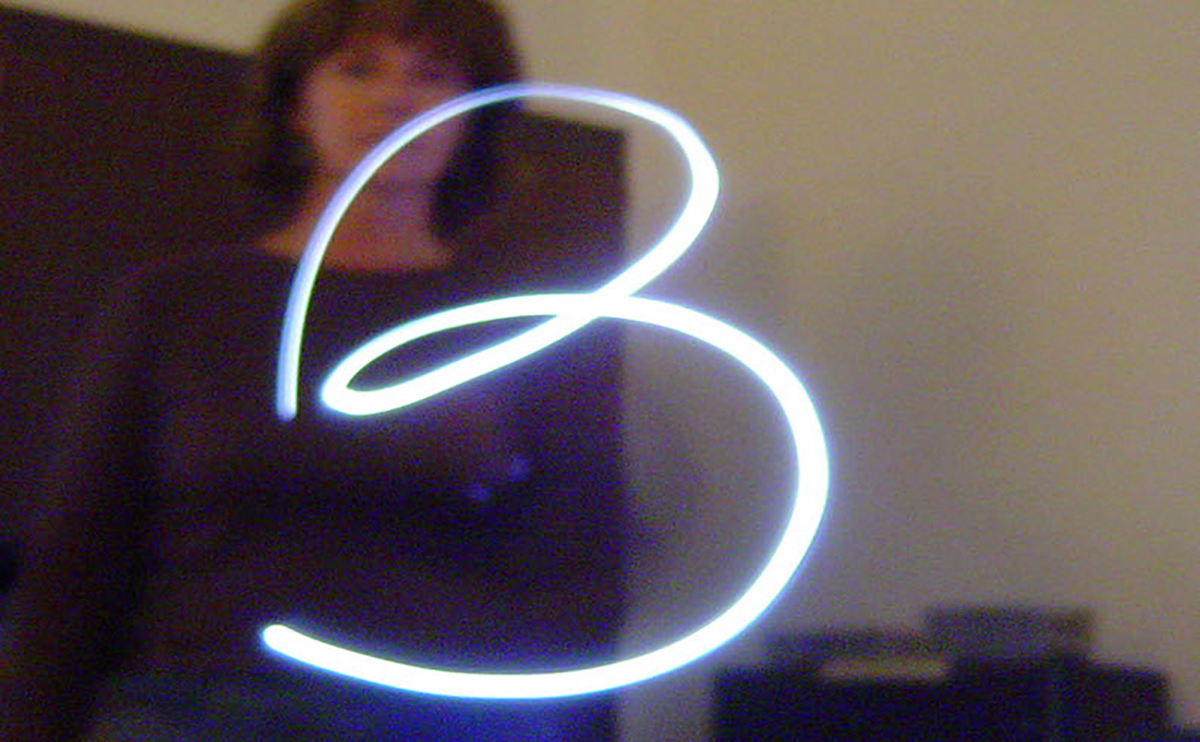 Partí de mi movimiento construyendo letras con el destello lumínico de una linterna, formando mi palabra designada “broma”. Prolongo el gesto corporal como lenguaje, escribo con el cuerpo.